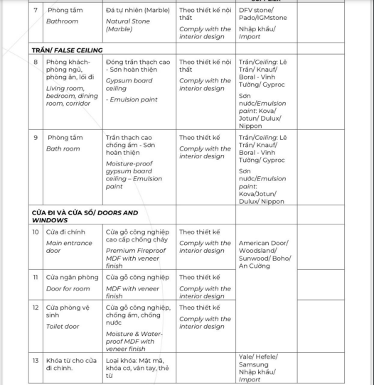 – Phòng tắm: Trần thạch cao chống ẩm, sơn hoàn thiện. Nhà cung cấp/ Nhãn hiệu Trần/Celing: Le Tran/ Knauf/ Borl- Vĩnh Tường/Gyproc. Sơn nước Emusion/ Jotun/ Dulux/ Nippon/ Cova.