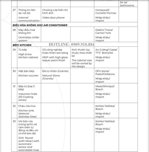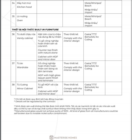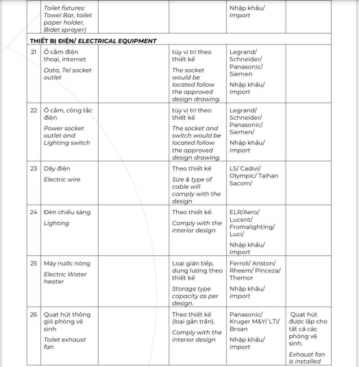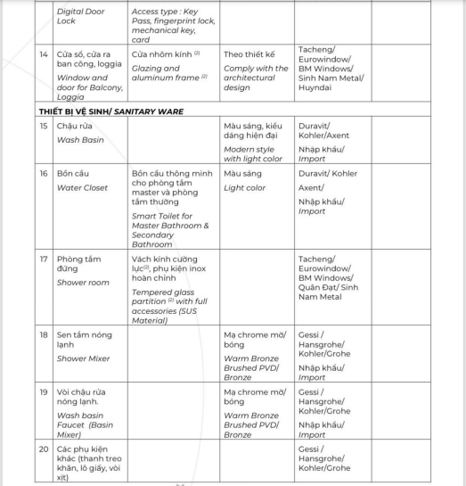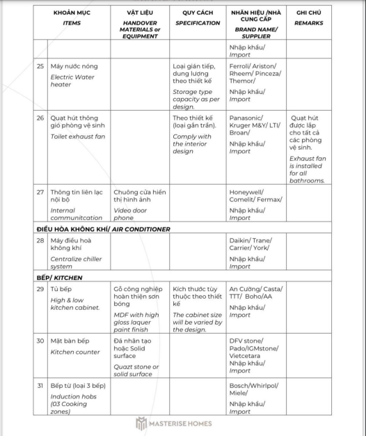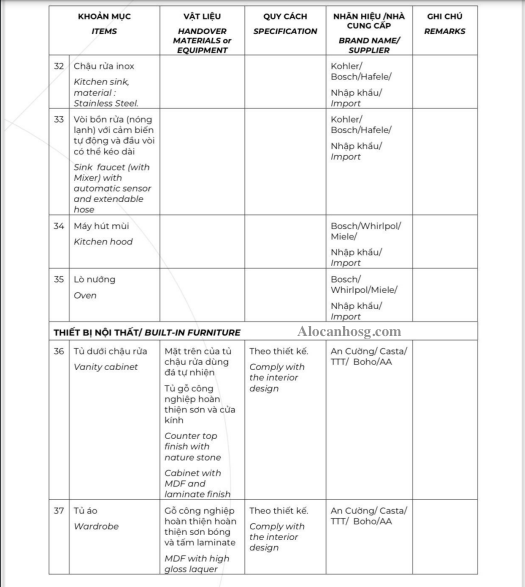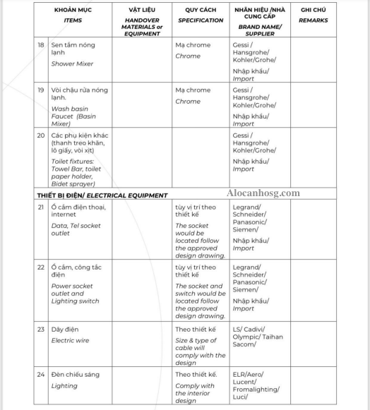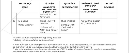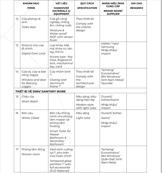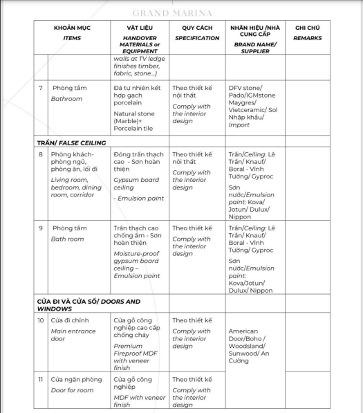 Danh mục vật liệu & Trang bị bàn giao căn hộ Grand Marina Saigon