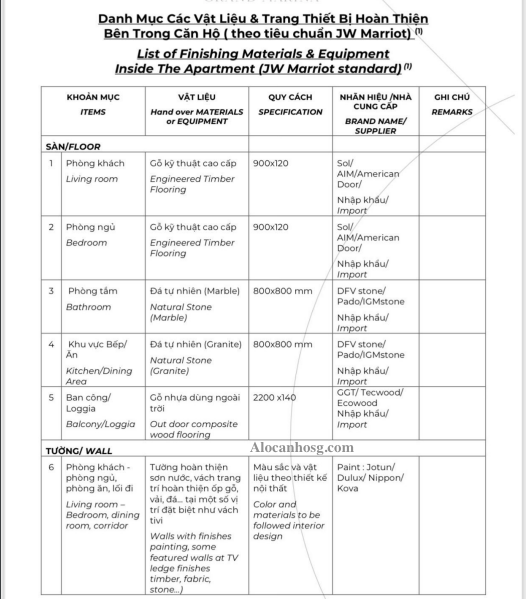 DANH MỤC VẬT LIỆU & BÀN GIAO HOÀN THIỆN CĂN HỘ JW MARRIOTT
