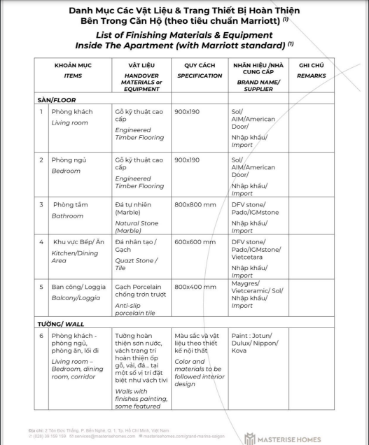 DANH MỤC VẬT LIỆU & BÀN GIAO HOÀN THIỆN CĂN HỘ MARRIOTT