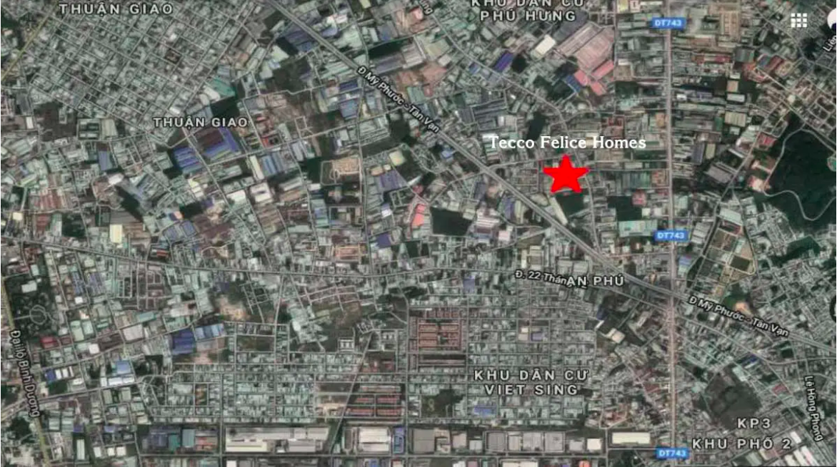 Dự án Tecco Felice Homes tọa lạc tại phường An Phú, TP Thuận An, tỉnh Dương. Sở hữu vị trí đắc địa trung tâm “đô thị hạt nhân”, dự án hưởng trọn vẹn lợi thế về hạ tầng giao thông kết nối cũng như tiếp cận nhanh chóng chuỗi tiện ích hiện hữu bao quanh.