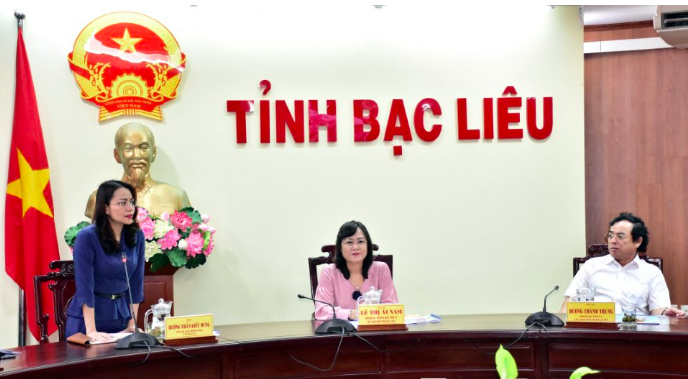 Bà Hương Trần Kiều Dung – Phó Giám đốc Thường trực Tập đoàn FLC (bìa trái) phát biểu tại buổi làm việc lãnh đạo tỉnh Bạc Liêu.