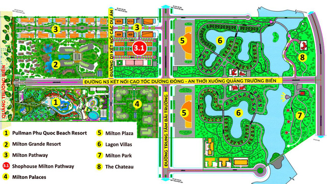 Dự án Milton Europa Village quy mô hơn 82ha trải dài trên 500m mặt biển nhìn thẳng ra vịnh Thái Lan, dự án được quy hoạch thành 8 phân khu (Khu nghỉ dưỡng Pullman Phú Quốc 5 sao do tập đoàn Accor vận hành; Milton Grande Resort 5 sao; Khu khách sạn từ 3 sao Milton Pathway & Khu nhà phố thương mại; Tổ hợp thương mại, khách sạn, giải trí cao 15 tầng Milton Plaza; Dự án khách sạn & Condotel Milton Palaces; Khu biệt thự ven hồ Lagon Villa; Khu công viên thư giãn & vui chơi Milton Park; Dinh thự The Chateau với cảnh quan và tiện ích đặc biệt).