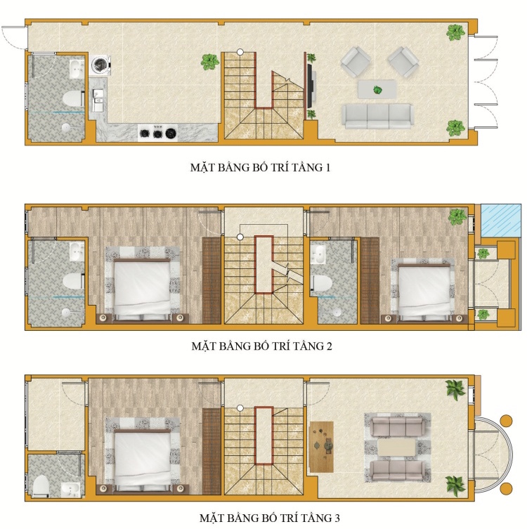 ➤ Quy cách thiết kế: 1 trệt + 2 lầu. Diện tích 67m2 – 80m2 – 114m2 (4×15, 4×17, 4×20, 4×25)
